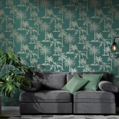 Ce papier peint durable a un motif tropical avec des arbres dans un design bleu sarcelle et argenté, est résistant à la déchirure et peut être enlevé avec un agent de décapage ou un vaporisateur de papier peint sans endommager votre mur.