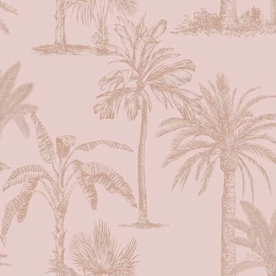Ce papier peint durable a un motif tropical avec des arbres dans un design rose délicat, est résistant à la déchirure et peut être enlevé avec un agent de décapage ou un vaporisateur de papier peint sans endommager votre mur.