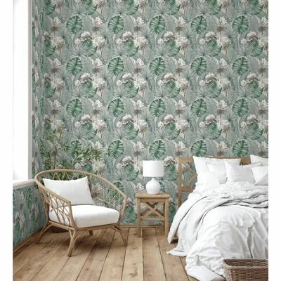 Ce papier peint durable présente un motif de jungle coloré avec des feuilles et des fleurs dans des couleurs gris et vert. Il peut même être retiré à sec sans endommager votre mur.