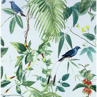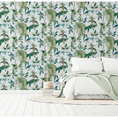 Ce papier peint durable a un aspect illustratif avec des oiseaux colorés, entourés de belles fleurs. Il présente les tons verts chauds du feuillage sur un fond bleu doux, parfait pour créer une ambiance botanique dans votre pièce sans être trop audacieux. Il peut même être retiré à sec sans endommager votre mur.