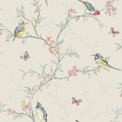 Le papier peint au motif Phoebe beige présente un motif gai avec des arbres, des fleurs et des oiseaux colorés.