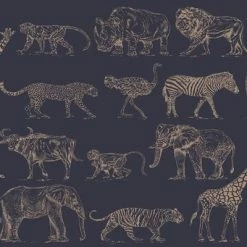 Ce papier peint Safari Midnight imprimé avec une encre métallique luxueuse de la marque Kids at Home rapproche beaucoup plus les animaux de la savane et de la jungle.