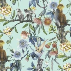 Faites entrer la nature dans votre maison avec ce papier peint exotique imprimé de singes en couleur turquoise.