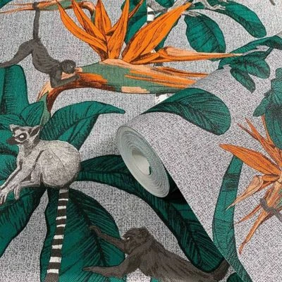 Ce papier peint vert, gris et orange Monkey Jungle Leaves fait partie de la collection Noordwand Topchic, qui comprend une grande variété de papiers peints avec des imprimés allant du moderne au classique et de belles couleurs tendance.