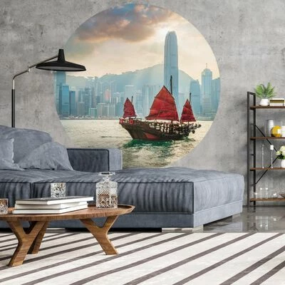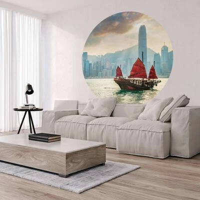 Ce papier peint unique et élégant en forme de cercle de 190 cm Skyline with Junk Boat avec un bel imprimé suit les dernières tendances en matière de décoration murale et fait partie de la collection Wallpaper Circle de la marque WallArt.